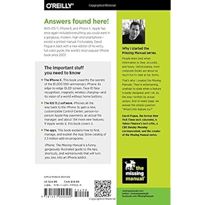 Lovely to look at, hard to see . . . This is my third Missing Manual, and at first I was delighted to see the more compact size, slick pages, and color illustrations. Then I tried to read it, and within seconds I knew I was in trouble: the text is printed in GRAY, not black. For anyone with visual limitations, this can be a deal-breaker. How ironic that a book which devotes an entire chapter to accessibility violates basic rules of legibility by taking away much-needed contrast between the text and the white paper behind it. Missing Manuals, what were you thinking???Luckily, I discovered that I could read it, but only under a very strong, bright light.I am completely new to iPhones--or any other smartphone--and have been working with this and two other books to get up to speed. The others are iPhone for Seniors for Dummies, which is helpful for introducing the basics; and iPhone 8, 8 Plus, and iPhone X from the Teaching yourself Visually series (especially useful with everything being clearly labeled on sample screens. I'm getting useful information from all of these books. But iPhone: the Missing Manual is by far the most thorough. For example, it w "first as the only one of the three that talked about the "burst" feature of the camera--something I didn't realize I had triggered.So it's wa worthwhile purchase, but David Pogue, PLEASE use black text in the future. (Note: the Kindle version does have black text--and a serif typeface as well--but I find that format too difficult to use with a reference book.